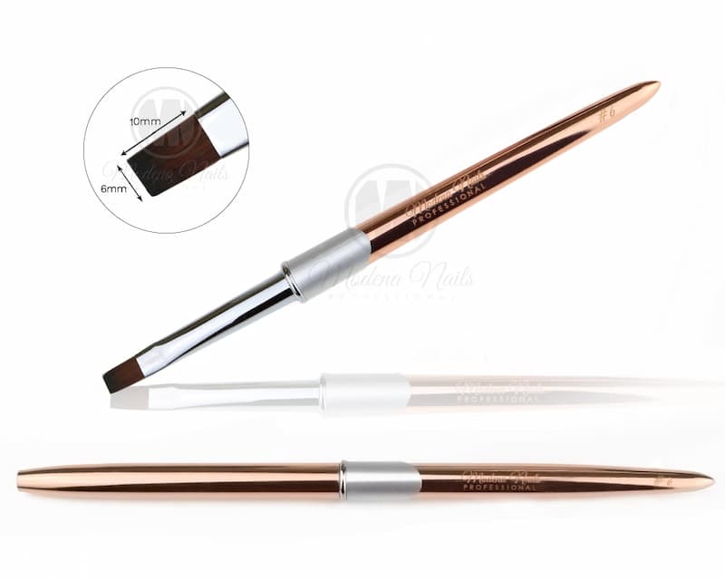 Kist za gel Exclusive Rose Gold #6 Izrada dizajna noktiju zahtijeva preciznost i brigu, ali osim vještine, bitni su proizvodi i alati izvrsne kvalitete. Modena Nails nudi izuzetne EKSKLUZIVNE ROSE GOLD kistove. Kist za gel EXCLUSIVE ROSE GOLD #6 odlikuje se izvrsnom kvalitetom dlake. Četkica je ravna i elastična, a sve to omogućuje savršeno nanošenje proizvoda i na pregibe noktiju. Proizvod namijenjen za oblikovanje noktiju gel metodom.