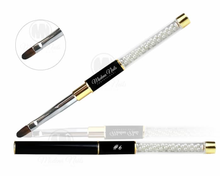 Ovalni kist za gel veličine #6 s ukrasnim perlama u dršci. Savršeno profilirana, mekana vlakna koja se pri radu s gelom ne šire u stranu Uživat ćete raditi s njim, a OVALNI oblik omogućuje precizno nanošenje gela oko kutikule. Kist ima poklopac na zatvaranje koja ga štiti od prljavštine i isušivanja. Vrlo lijepo izrađen s puno sitnih bisera iznutra koji dodaju šarm. Dimenzije dlake kista: Duljina: 10 mm Širina: 6mm